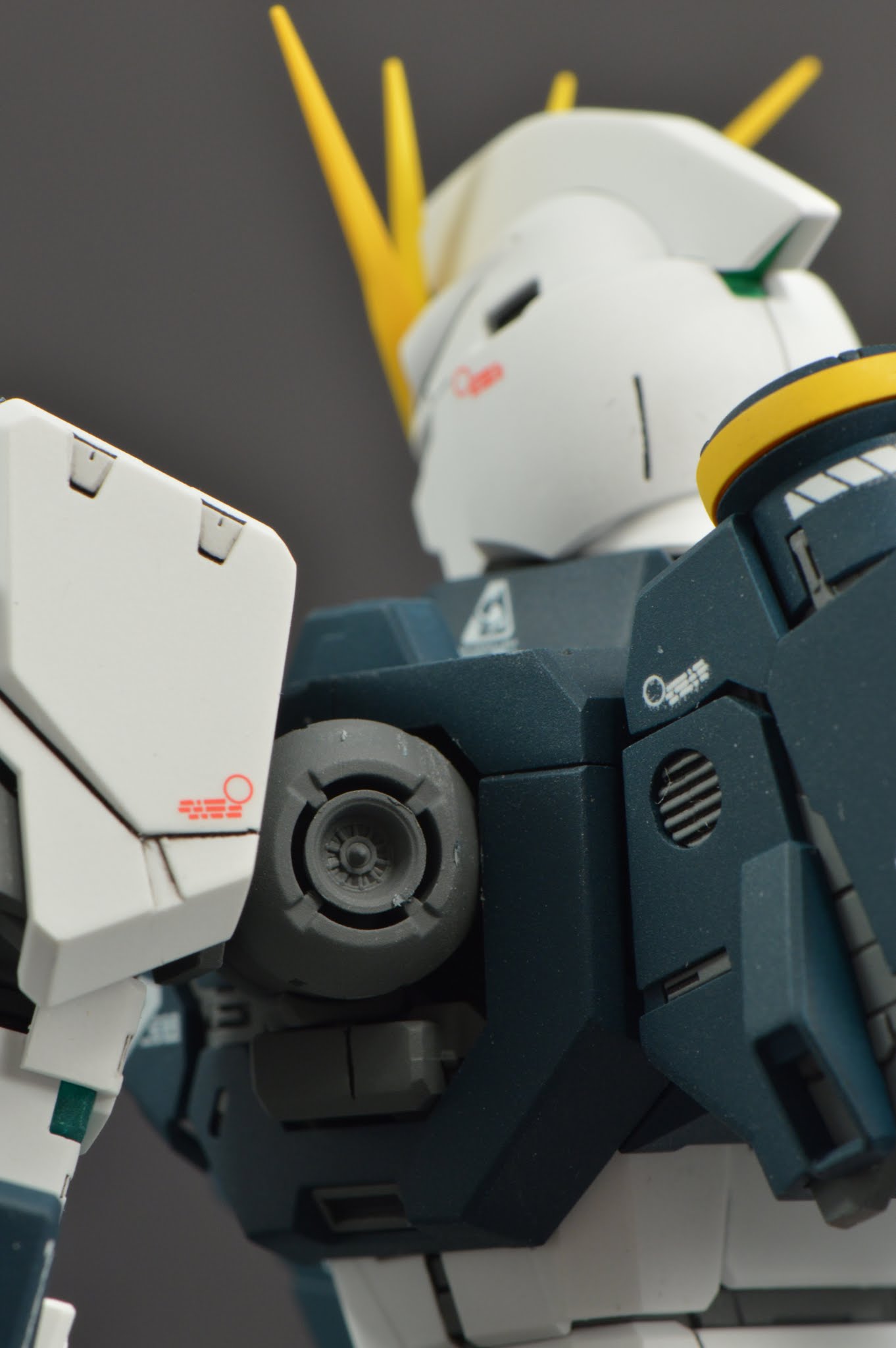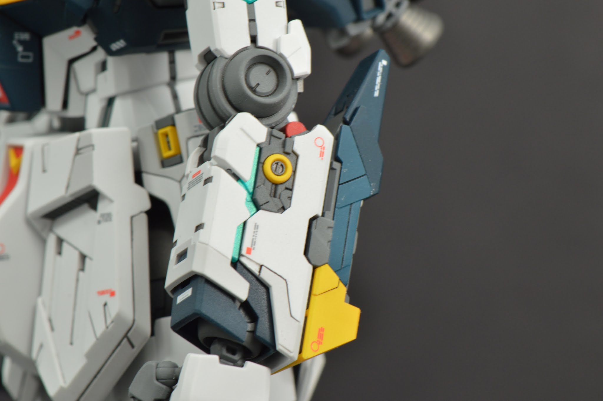 I really like how the lens kit from Bandai can be used to add extra psycho-frame like detail into the shoulder joint. On the backside of this joint I inserted the smallest inner detail from the 1/144 vernier builders parts kit.