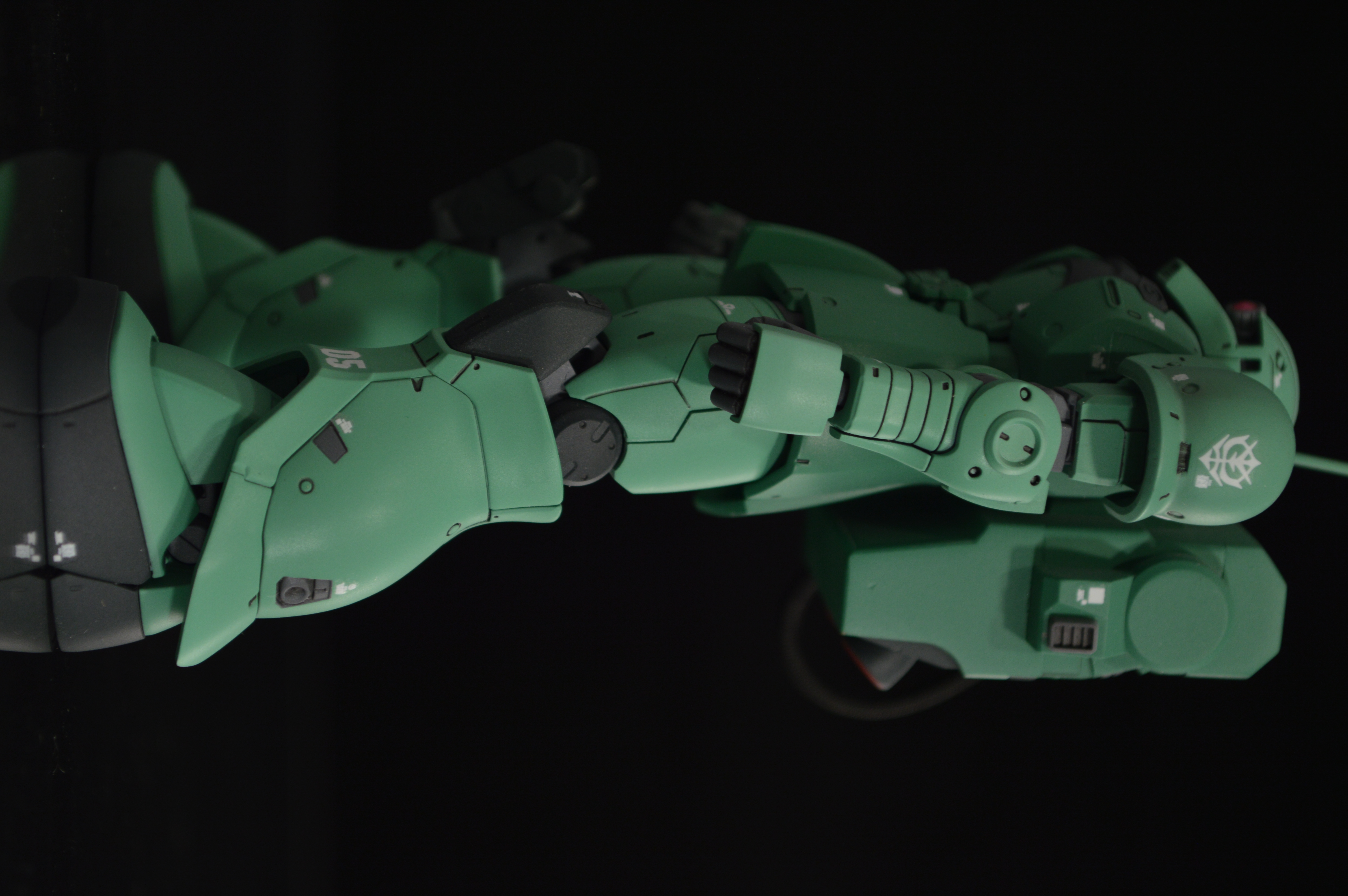 I chose a subdued green color palette for the design with tones based on the canon design. The decal scheme followed the basic Origin layout with some inspiration from the RG Zaku and some of my other decal schemes.